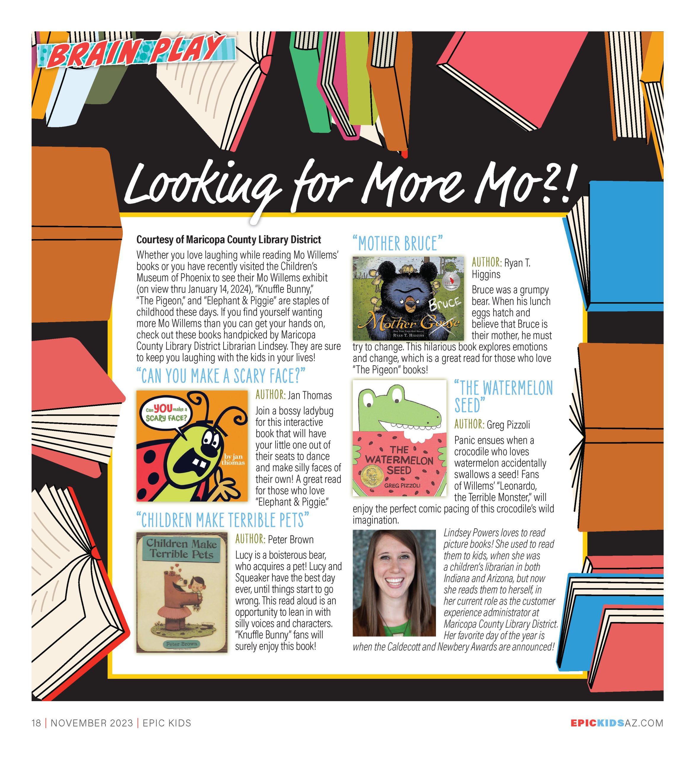 Whether you love laughing while reading Mo Willems’ books or you have recently visited the Children’s Museum of Phoenix to see their Mo Willems exhibit (on view thru January 14, 2024), “Knuffle Bunny,” “The Pigeon,” and “Elephant & Piggie” are staples of childhood these days. If you find yourself wanting more Mo Willems than you can get your hands on, check out these books handpicked by Maricopa County Library District librarian Lindsey. They are sure to keep you laughing with the kids in your lives!