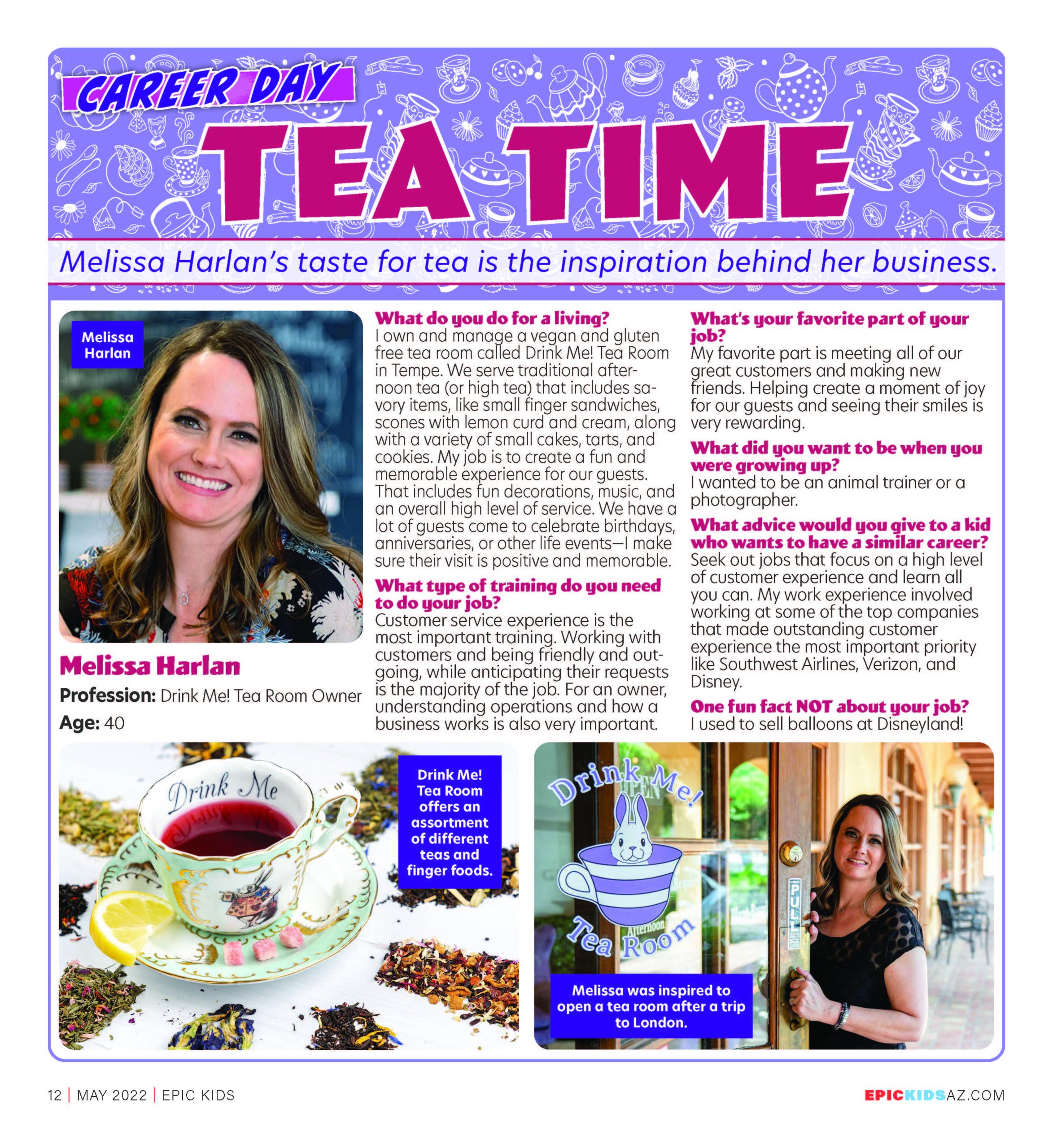 I own and manage a vegan and gluten free tea room called Drink Me! Tea Room in Tempe. We serve traditional afternoon tea (or high tea) that includes savory items, like small finger sandwiches, scones with lemon curd and cream, along with a variety of small cakes, tarts, and cookies. My job is to create a fun and memorable experience for our guests. That includes fun decorations, music, and an overall high level of service. We have a lot of guests come to celebrate birthdays, anniversaries, or other life events––I make sure their visit is positive and memorable.