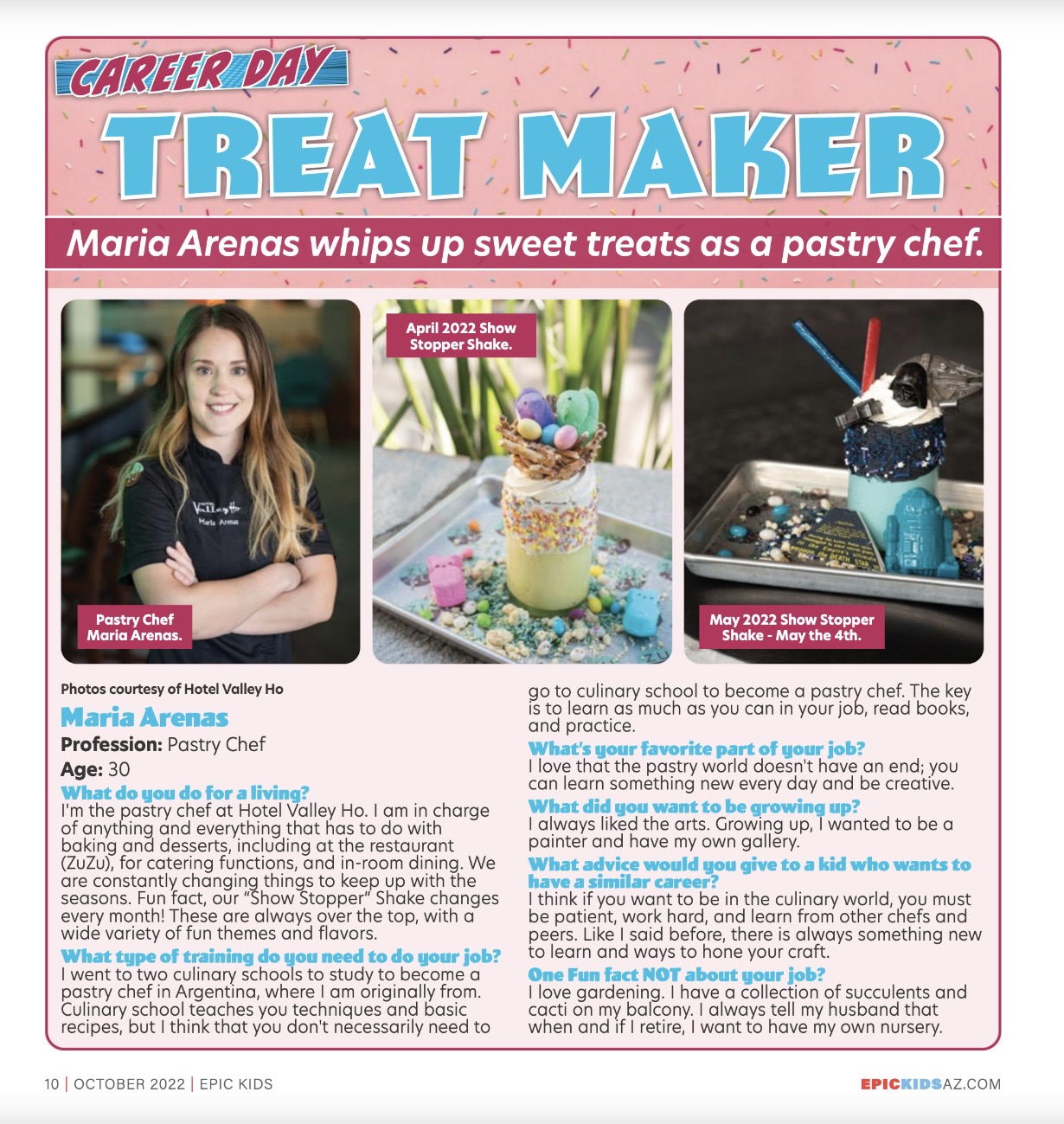 I’m the pastry chef at Hotel Valley Ho. I am in charge of anything and everything that has to do with baking and desserts, including at the restaurant (ZuZu), for catering functions, and in-room dining. We are constantly changing things to keep up with the seasons. Fun fact, our “Show Stopper” Shake changes every month! These are always over the top, with a wide variety of fun themes and flavors.