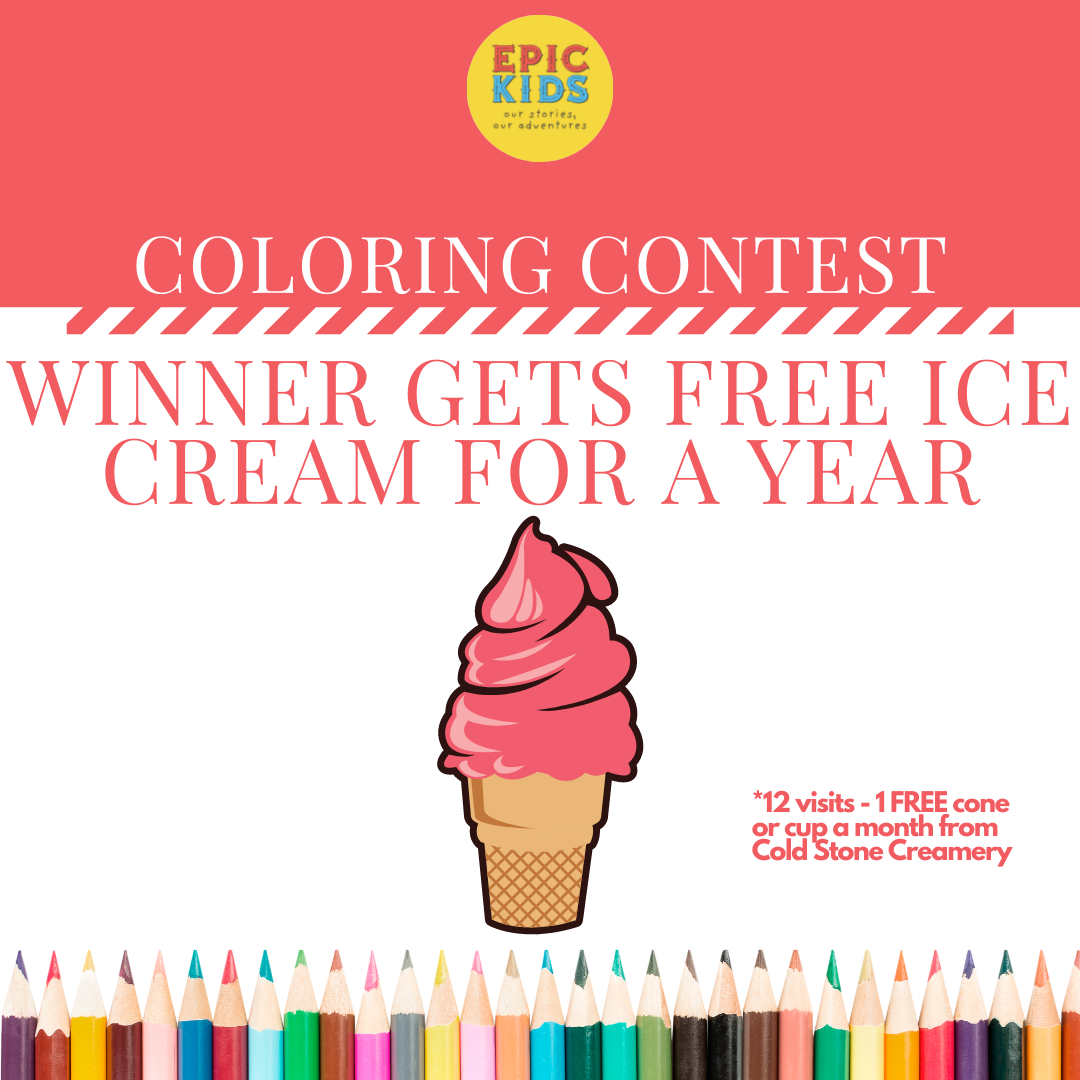 In honor of National Coloring Book Day, held on Aug. 2, 2021, Epic Kids is hosting a Coloring Contest. The winner receives FREE ice cream for a year (1 ice cream cone or cup each month for 12 months) from Cold Stone Creamery.