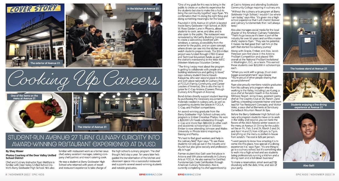 Founded in 2019, Avenue 27, which is located inside Barry Goldwater High School, at 2820 W. Rose Garden Lane in Phoenix, allows students to cook, serve, and dine, and is also open to the public. The restaurant was remodeled by McCarthy Building Companies to create a welcoming storefront with windows, a canopy, accessibility from the exterior for the public, and an open concept, where diners can see into the kitchen and watch students prepare meals. The $1.5 million project was funded through CTED (Career and Technical Education) funds as part of the district’s membership in the West-MEC (Western Maricopa Education Center).