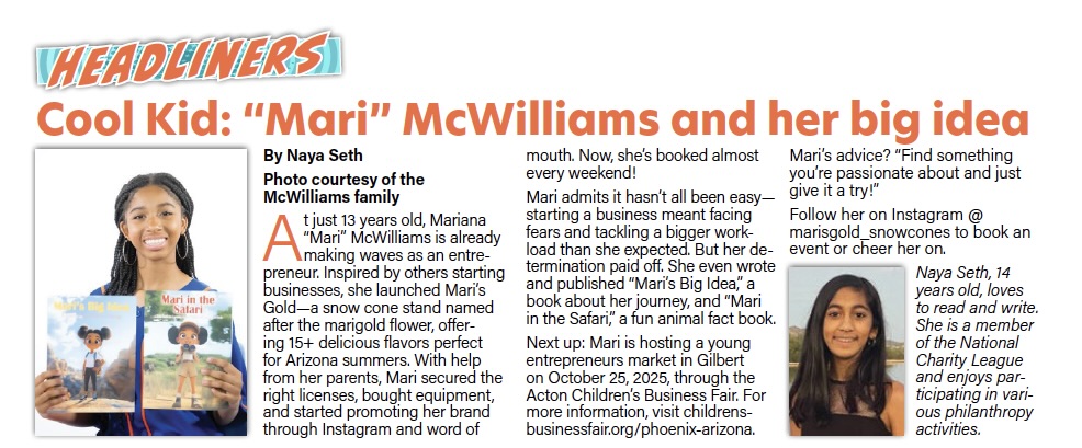 At just 13 years old, Mariana “Mari” McWilliams is already making waves as an entrepreneur. Inspired by others starting businesses, she launched Mari’s Gold—a snow cone stand named after the marigold flower, offering 15+ delicious flavors perfect for Arizona summers. With help from her parents, Mari secured the right licenses, bought equipment, and started promoting her brand through Instagram and word of mouth. Now, she’s booked almost every weekend!