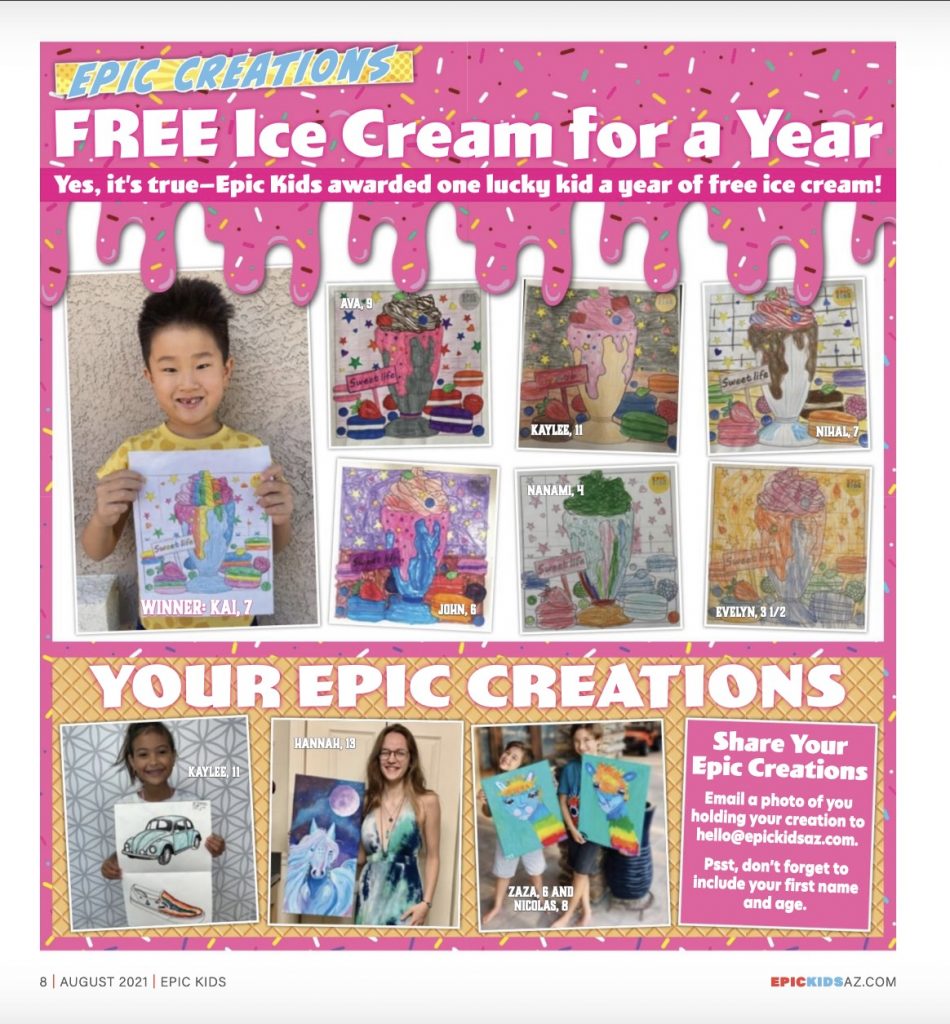 View Larger Image Epic Kids Awarded One Lucky Kid a Year of Free Ice Cream Sondra Barr2021-09-07T21:34:44-07:00September 7, 2021|Categories: Epic Kids|Tags: Epic Kids, Epic Kids winner, Free Ice Cream, Winner| Congratulations to Kai, 7, for winning a year of free ice cream from Epic Kids. Share This With Your Friends: FacebookXRedditLinkedInWhatsAppTumblrPinterestEmail Related Posts