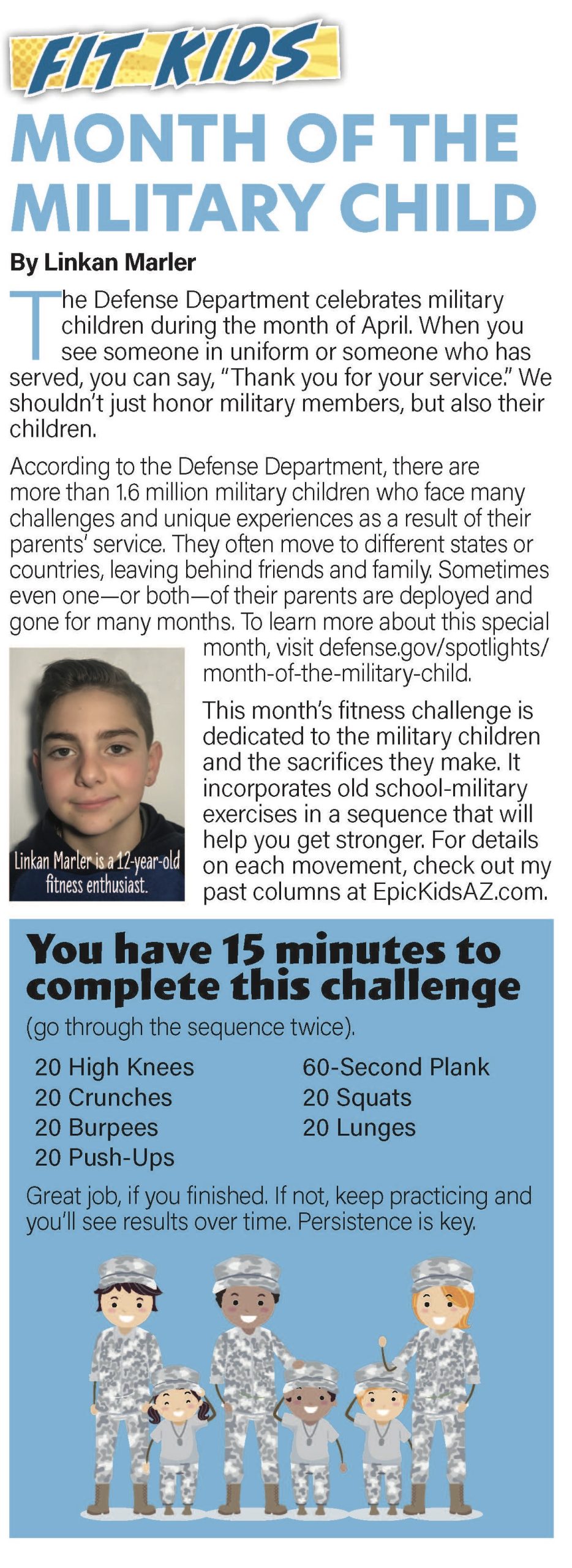This month’s fitness challenge is dedicated to the military children and the sacrifices they make. It incorporates old school-military exercises in a sequence that will help you get stronger. For details on each movement, check out my past columns at EpicKidsAZ.com.