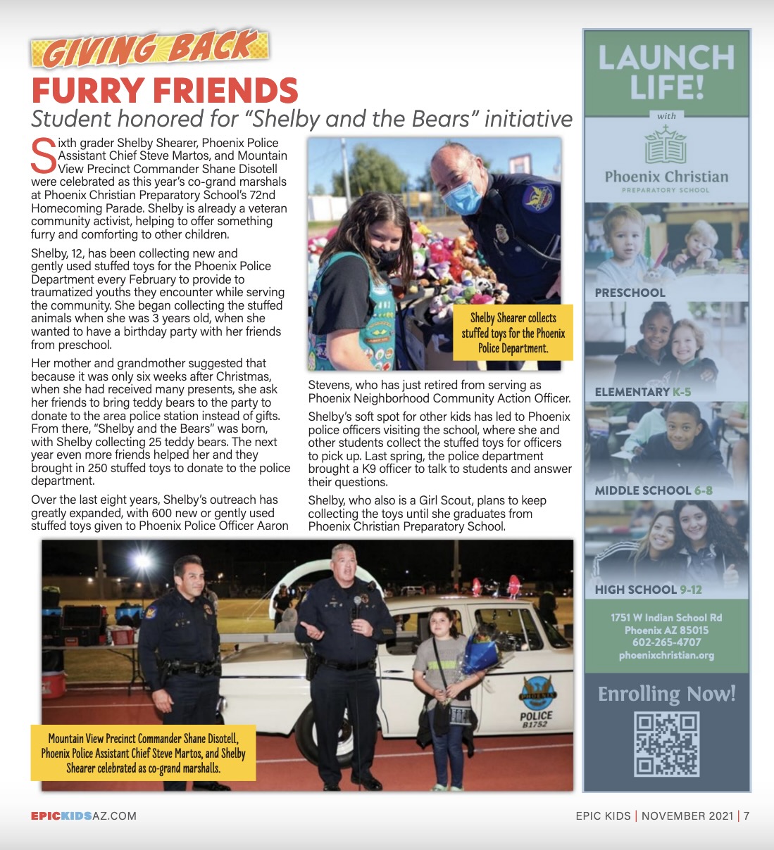 Sixth grader Shelby Shearer, Phoenix Police Assistant Chief Martos, and Mountain View Precinct Commander Disotell were celebrated as this year’s Co-Grand Marshals at Phoenix Christian Preparatory School’s 72nd Homecoming Parade. Shelby is already a veteran community activist, helping to offer something furry and comforting to other children.
