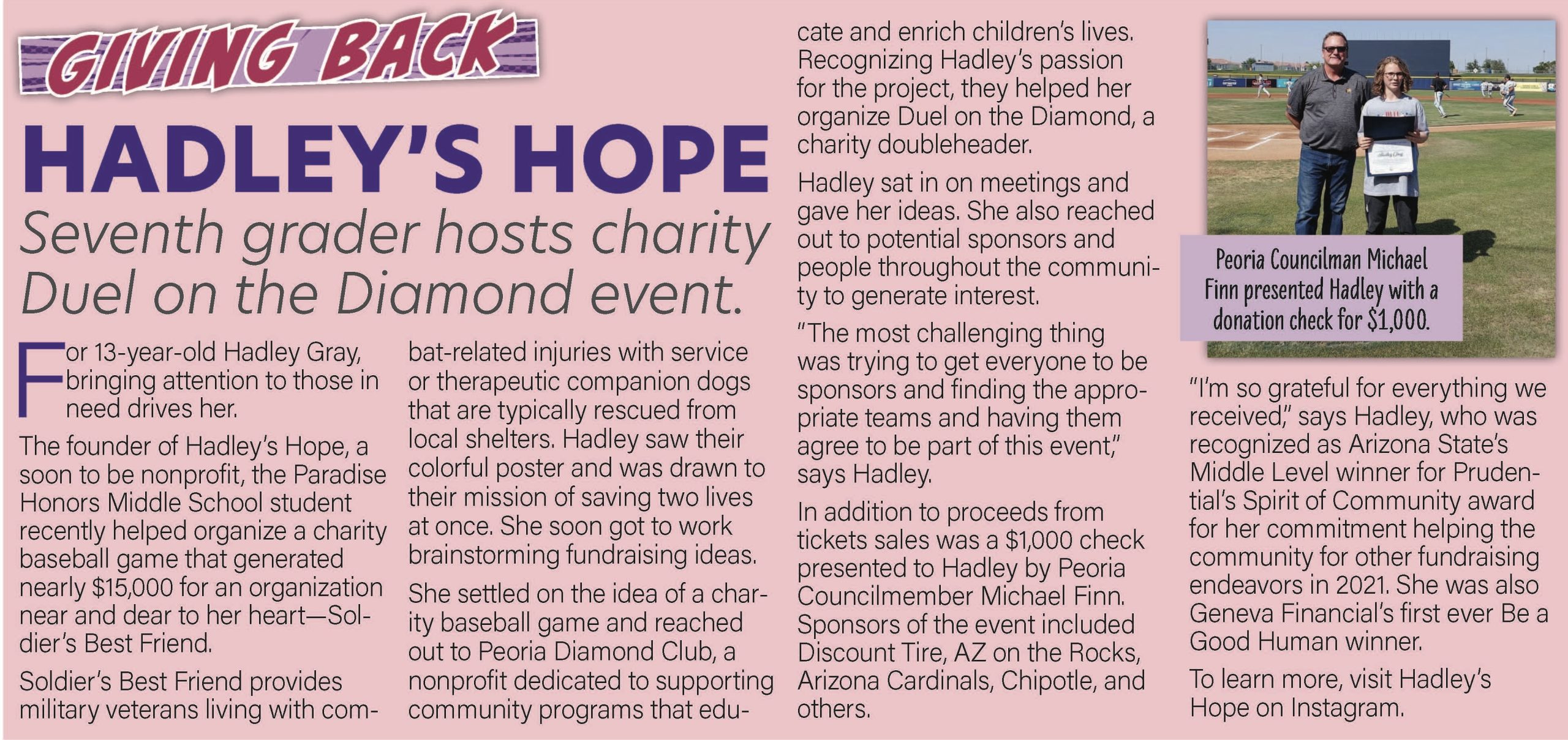 The founder of Hadley’s Hope, a soon to be nonprofit, the Paradise Honors Middle School student recently helped organize a charity baseball game that generated nearly $15,000 for an organization near and dear to her heart––Soldier’s Best Friend.