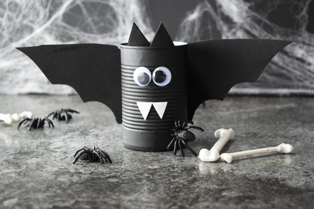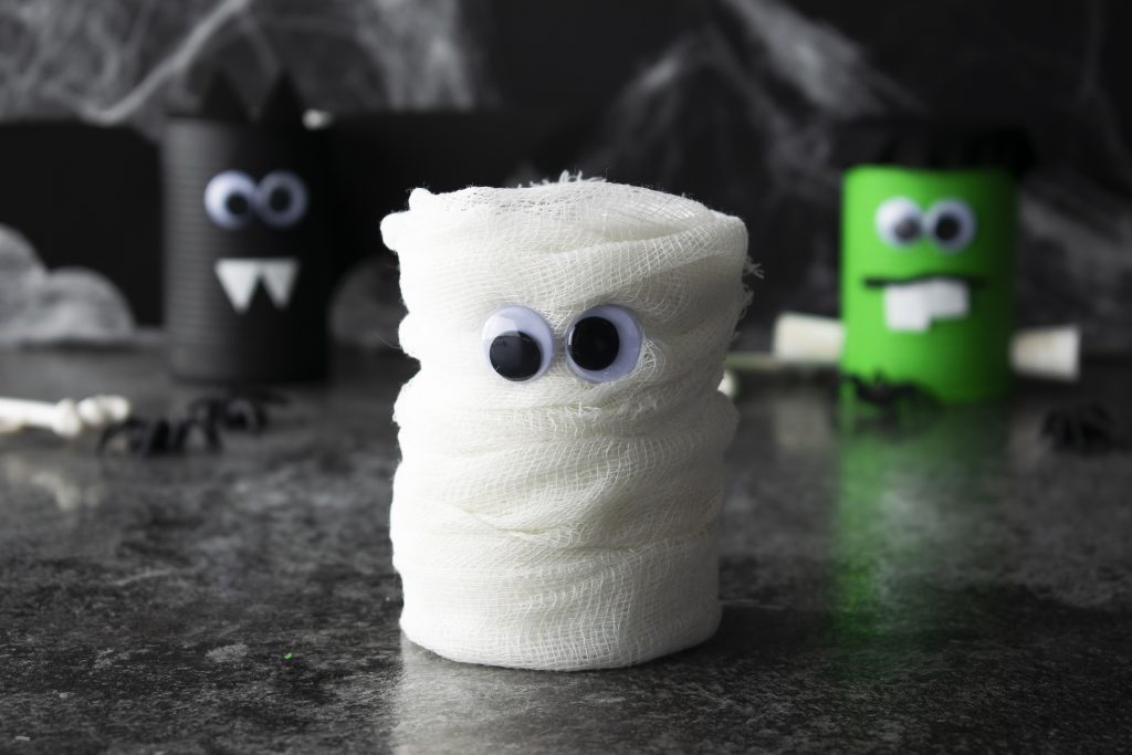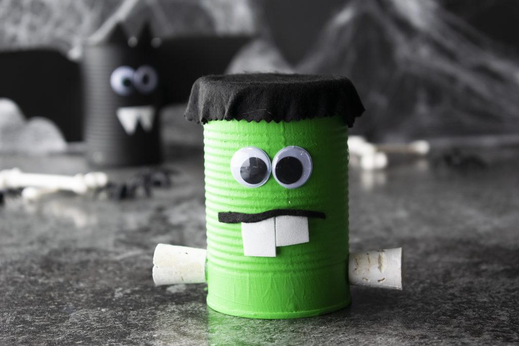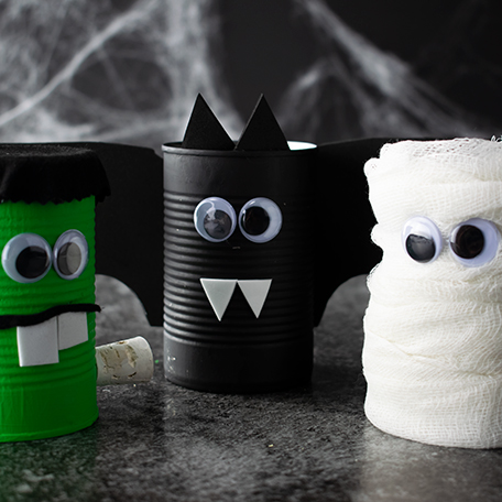 Get the kids involved with Halloween decorations this year with these easy-to-make “spooky cans” resembling a bat, Frankenstein, and a mummy.