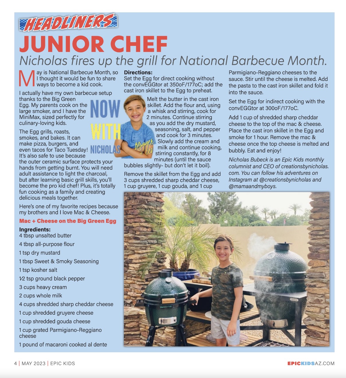 I actually have my own barbecue setup thanks to the Big Green Egg. My parents cook on the large smoker, and I have the MiniMax, sized perfectly for culinary-loving kids.