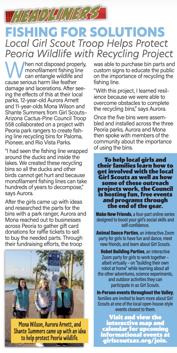 When not disposed properly, monofilament fishing line can entangle wildlife and cause serious harm like feather damage and lacerations. After seeing the effects of this at their local parks, 12-year-old Aurora Arnett and 11-year-olds Mona Wilson and Shante Summers from Girl Scouts–Arizona Cactus-Pine Council Troop 558 collaborated on a project with Peoria park rangers to create fishing line recycling bins for Paloma, Pioneer, and Rio Vista Parks.