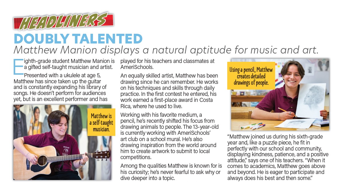 Presented with a ukulele at age 5, Matthew has since taken up the guitar and is constantly expanding his library of songs. He doesn’t perform for audiences yet, but is an excellent performer and has played for his teachers and classmates at AmeriSchools.