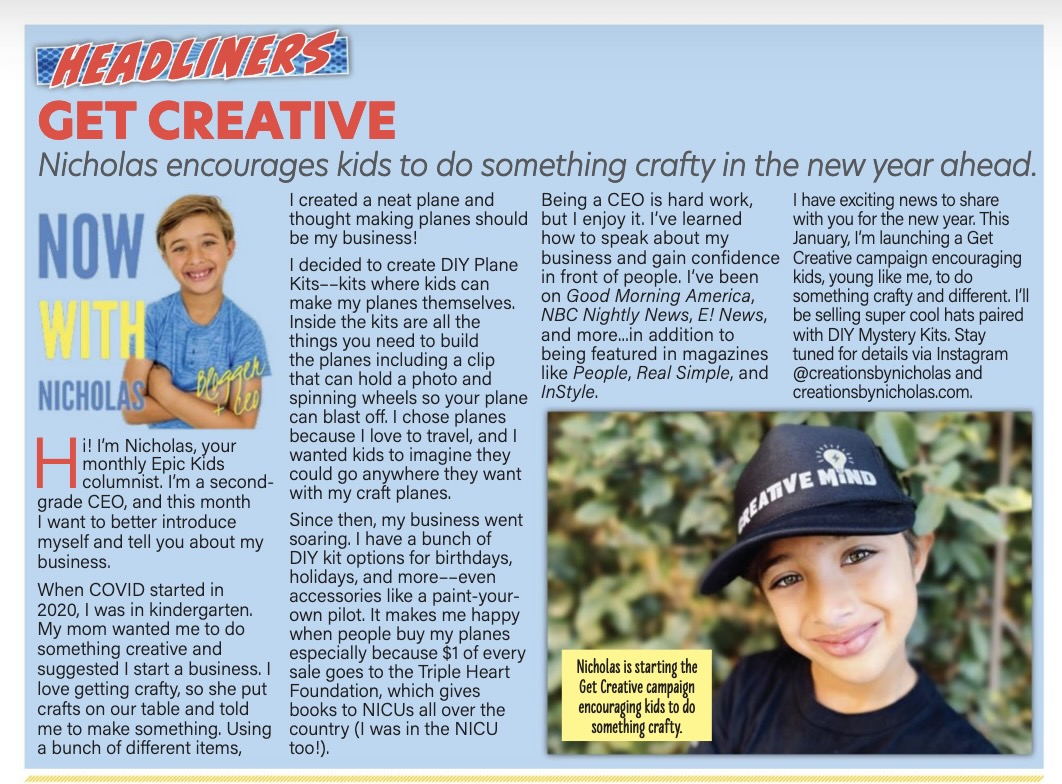 I have exciting news to share with you for the new year. This January, I’m launching a Get Creative campaign encouraging kids young like me to do something crafty and different. I’ll be selling super cool hats paired with DIY Mystery Kits. Stay tuned for details via Instagram @creationsbynicholas and creationsbynicholas.com.