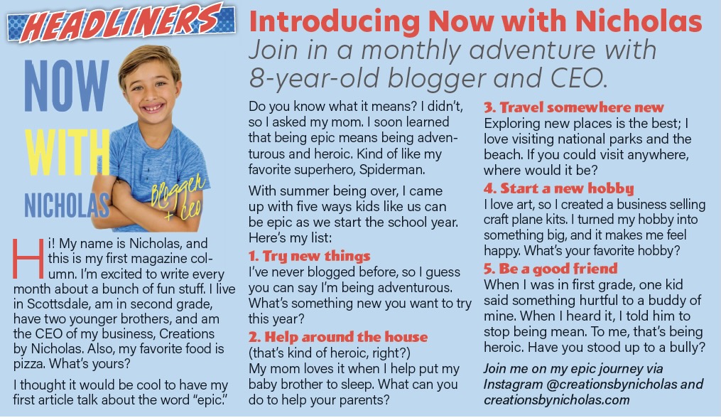 Hi! My name is Nicholas, and this is my first magazine column. I’m excited to write every month about a bunch of fun stuff. I live in Scottsdale, am in second grade, have two younger brothers, and am the CEO of my business, Creations by Nicholas. Also, my favorite food is pizza. What’s yours?