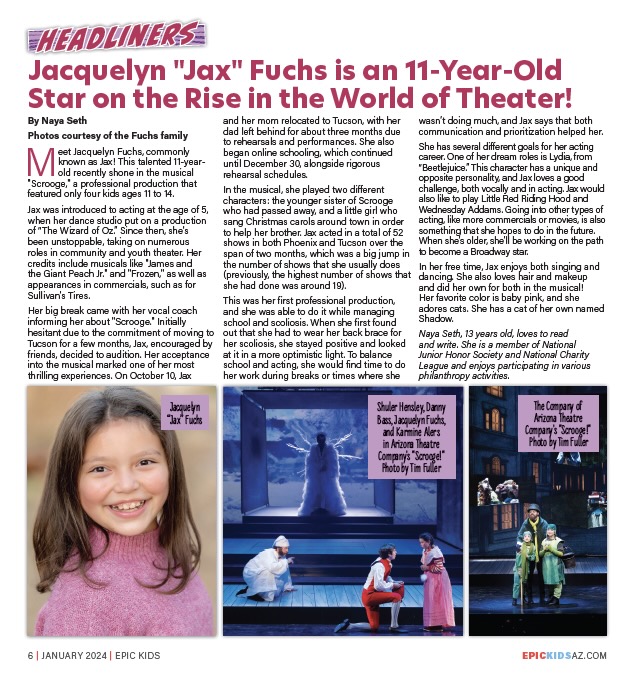 By Naya Seth Meet Jacquelyn Fuchs, commonly known as Jax! This talented 11-year-old recently shone in the musical "Scrooge," a professional production that featured only four kids aged 11 to 14. Jax was introduced to acting at the age of ...