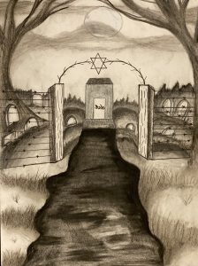 The third drawing was done in charcoal and graphite pencils and it is called “The Graves”. This is an image of a Jewish Cemetery in a dark, secluded forest at nighttime. The graves are unmarked since many Jewish People were forgotten. The fence has barbed wires like the concentration camps and the entry has a metal wire shaped into a Jewish Star. The one large grave in the middle has the term “Jude” which was a required pin that all Jews had to wear on their chest. The actual meaning of the word, Jude, is “Praised” so I thought it was a strong word and symbolic to place on the center grave.