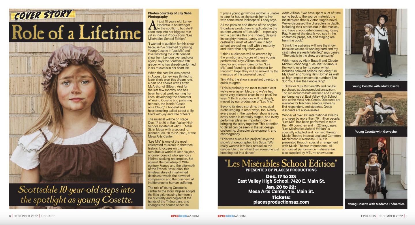“I wanted to audition for this show because I’ve dreamed of playing Young Cosette in ‘Les Mis’ and love watching the 25th concert show from London over and over again,” says the Scottsdale fifth grader, who has already performed in six musicals in her short life.