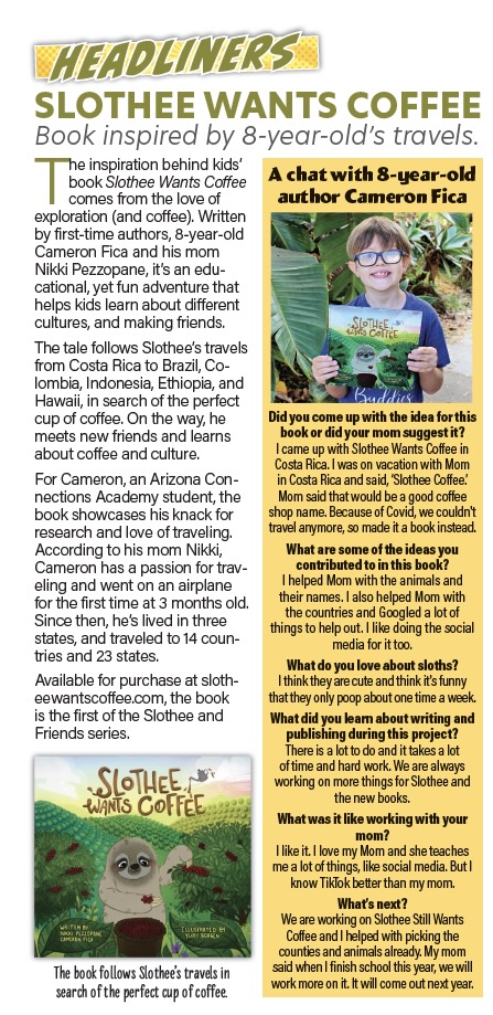 The inspiration behind kids’ book Slothee Wants Coffee comes from the love of exploration (and coffee). Written by first-time authors, 8-year-old Cameron Fica and his mom Nikki Pezzopane, it’s an educational, yet fun adventure that helps kids learn about different cultures, and making friends.