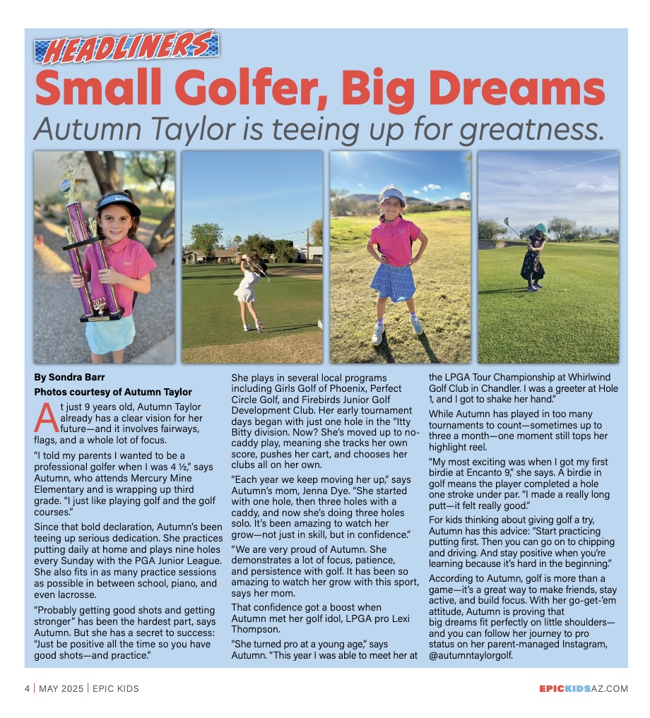 According to Autumn, golf is more than a game—it’s a great way to make friends, stay active, and build focus. With her go-get-’em attitude, Autumn is proving that big dreams fit perfectly on little shoulders—and you can follow her journey to pro status on her parent-managed Instagram, @autumntaylorgolf.
