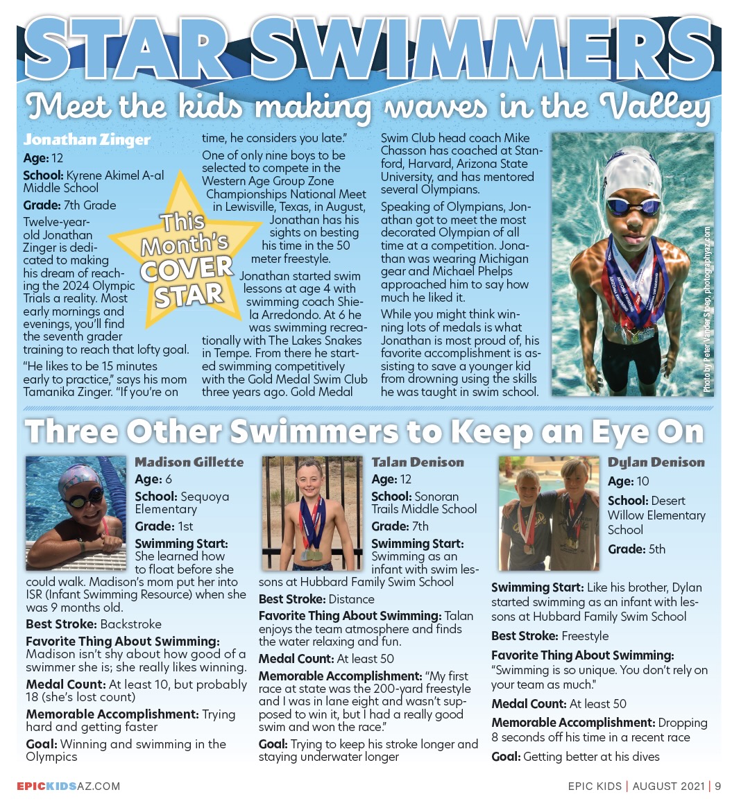 Jonathan started swim lessons at age 4 with swimming coach Shiela Arredondo. At 6 he was swimming recreationally with The Lakes Snakes in Tempe. From there he started swimming competitively with the Gold Medal Swim Club three years ago. Gold Medal Swim Club head coach Mike Chasson has coached at Stanford, Harvard, Arizona State University, and has mentored several Olympians.