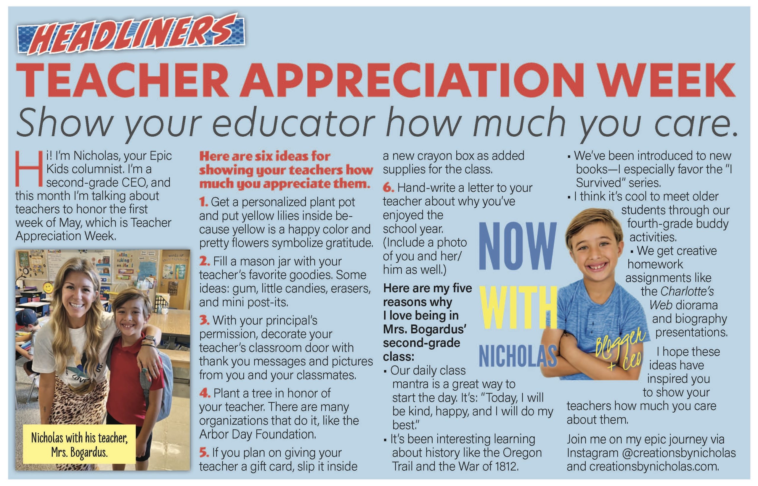 Hi! I’m Nicholas, your Epic Kids columnist. I’m a second grade CEO, and this month I’m blogging about teachers to honor the first week of May, which is Teacher Appreciation Week.