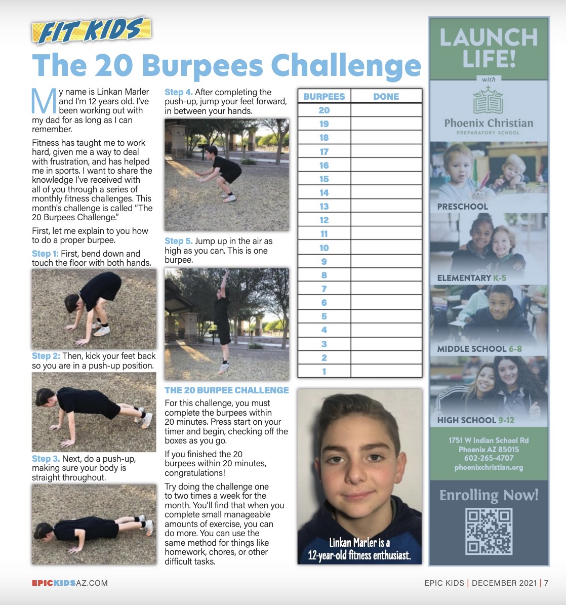 My name is Linkan Marler and I’m 12 years old. I’ve been working out with my dad for as long as I can remember. Fitness has taught me to work hard, given me a way to deal with frustration, and has helped me in sports. I want to share the knowledge I’ve received with all of you through a series of monthly fitness challenges. This month’s challenge is called “The 20 Burpees Challenge.” First, let me explain to you how to do a proper burpee.