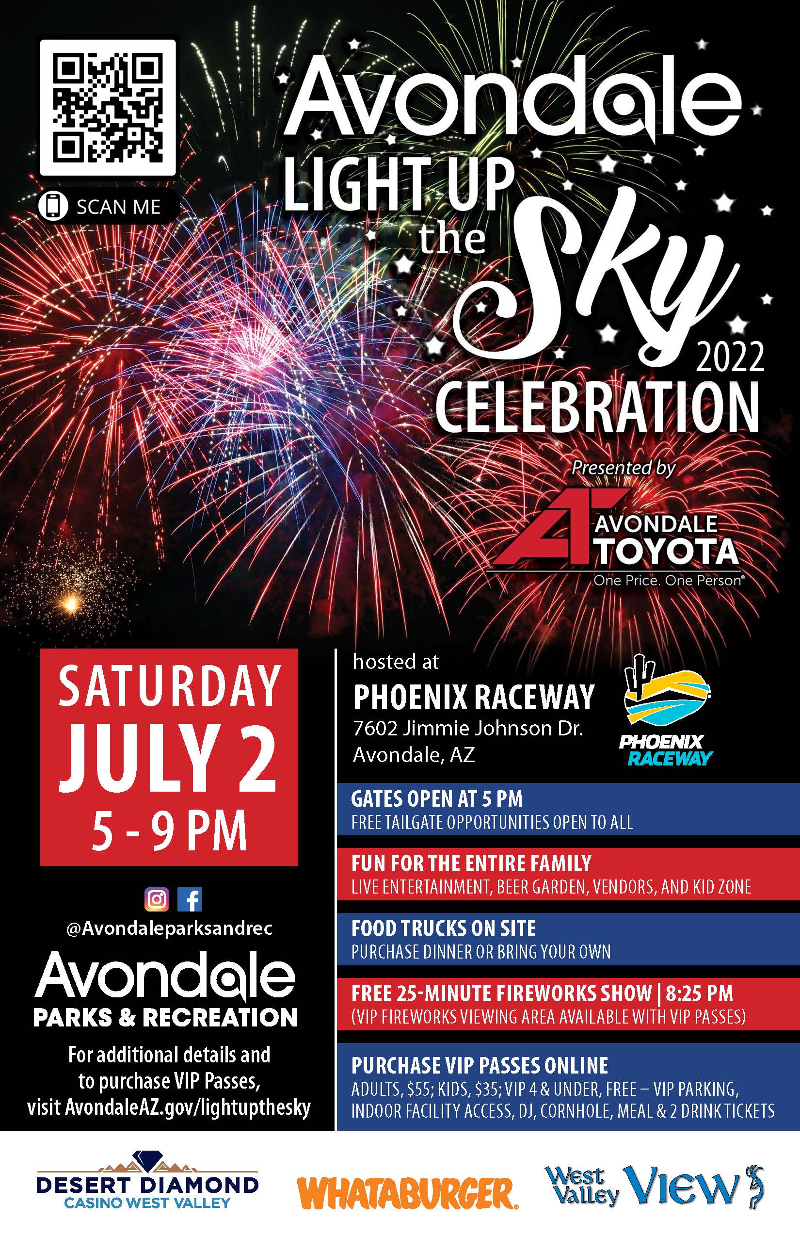 Who’s ready for Avondale Light Up the Sky Celebration Presented by Avondale Toyota?! This event at Phoenix Raceway includes VIP or general admission tailgate options, all of our fun activities, games, crafts, food trucks, live music presented by Desert Diamond Casino West Valley, and a 25-minute spectacular fireworks show, come on out and enjoy this celebration of Independence Day on a Saturday!