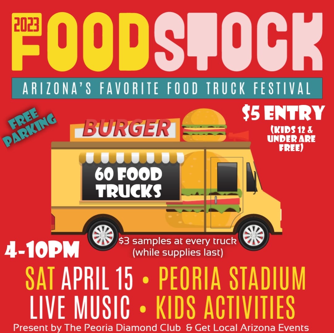 Families will enjoy more than 55 local food trucks with $3 samples, free bounce houses, a splashpad, a playground, and face painting at Food Stock. All gate proceeds will help feed hungry children in the West Valley through the Peoria Diamond Club’s nonprofit program.
