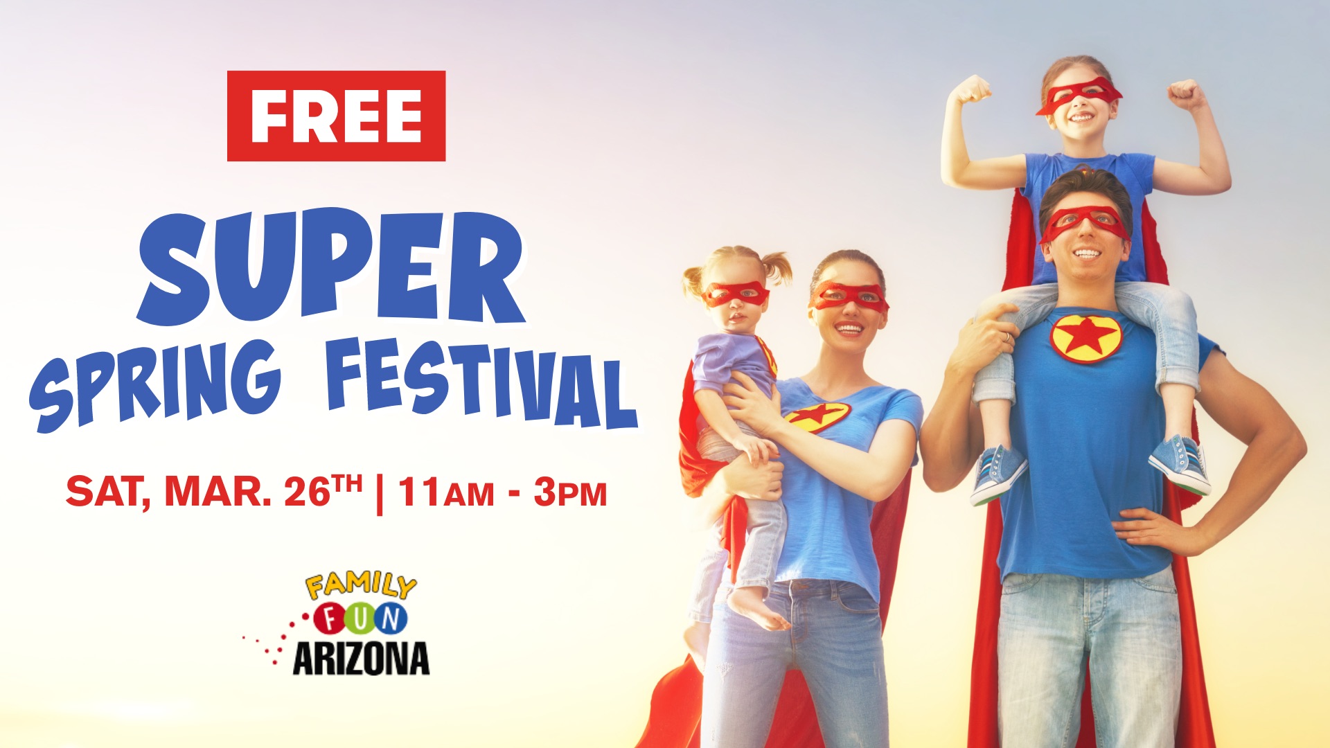 Family Fun Arizona is putting on the most SUPER Event in town! Meet superheroes like Captain America, Wonder Woman, Batman, scale giant rock walls, and enjoy interactive stage entertainment, bounce houses, face painting, coloring contests, music, games, and tons of prizes! Free event.