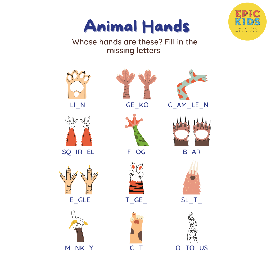 View Larger Image Animal Hands Sondra Barr2021-05-21T11:53:53-07:00May 21, 2021|Categories: Free Epic Kids Printables|Tags: Animal Hands, Epic Kids, Free Printables| Whose hands are these? Fill in the missing letters. Share This With Your Friends: FacebookXRedditLinkedInWhatsAppTumblrPinterestEmail Related Posts