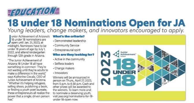 Junior Achievement of Arizona’s 18 under 18 nominations are open until Jan. 31, 2023, at midnight. Nominees have to be under 18 years of age by July 1, 2022, and attend kindergarten through 12th grade in Arizona.