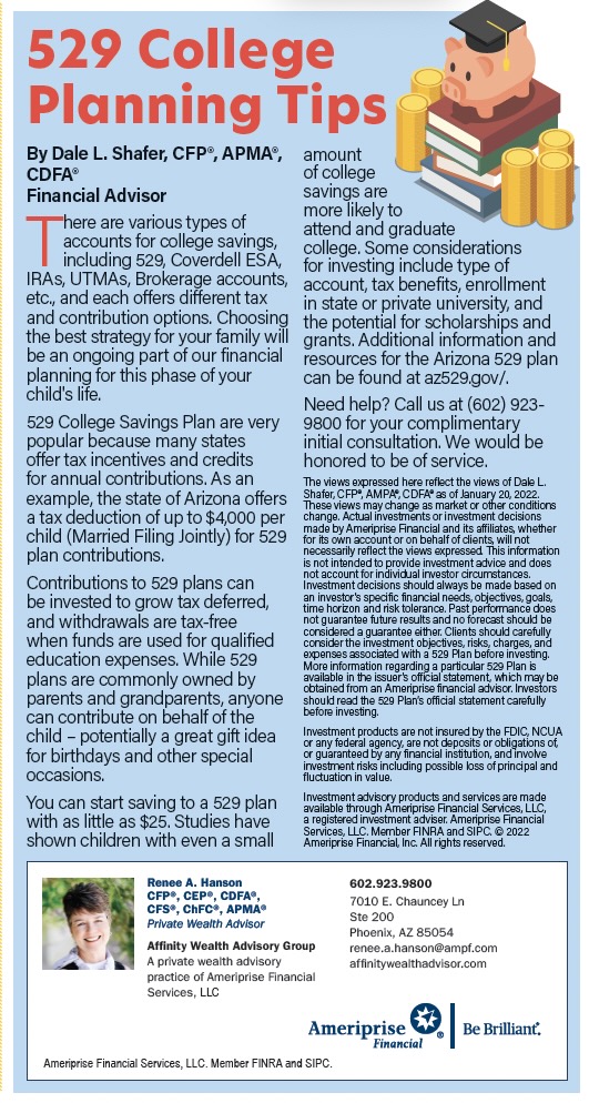 The views expressed here reflect the views of Dale L. Shafer, CFP®, AMPA®, CDFA® as of January 20, 2022. These views may change as market or other conditions change. Actual investments or investment decisions made by Ameriprise Financial and its affiliates, whether for its own account or on behalf of clients, will not necessarily reflect the views expressed. This information is not intended to provide investment advice and does not account for individual investor circumstances. Investment decisions should always be made based on an investor’s specific financial needs, objectives, goals, time horizon and risk tolerance. Past performance does not guarantee future results and no forecast should be considered a guarantee either. Clients should carefully consider the investment objectives, risks, charges, and expenses associated with a 529 Plan before investing. More information regarding a particular 529 Plan is available in the issuer’s official statement, which may be obtained from an Ameriprise financial advisor. Investors should read the 529 Plan’s official statement carefully before investing.