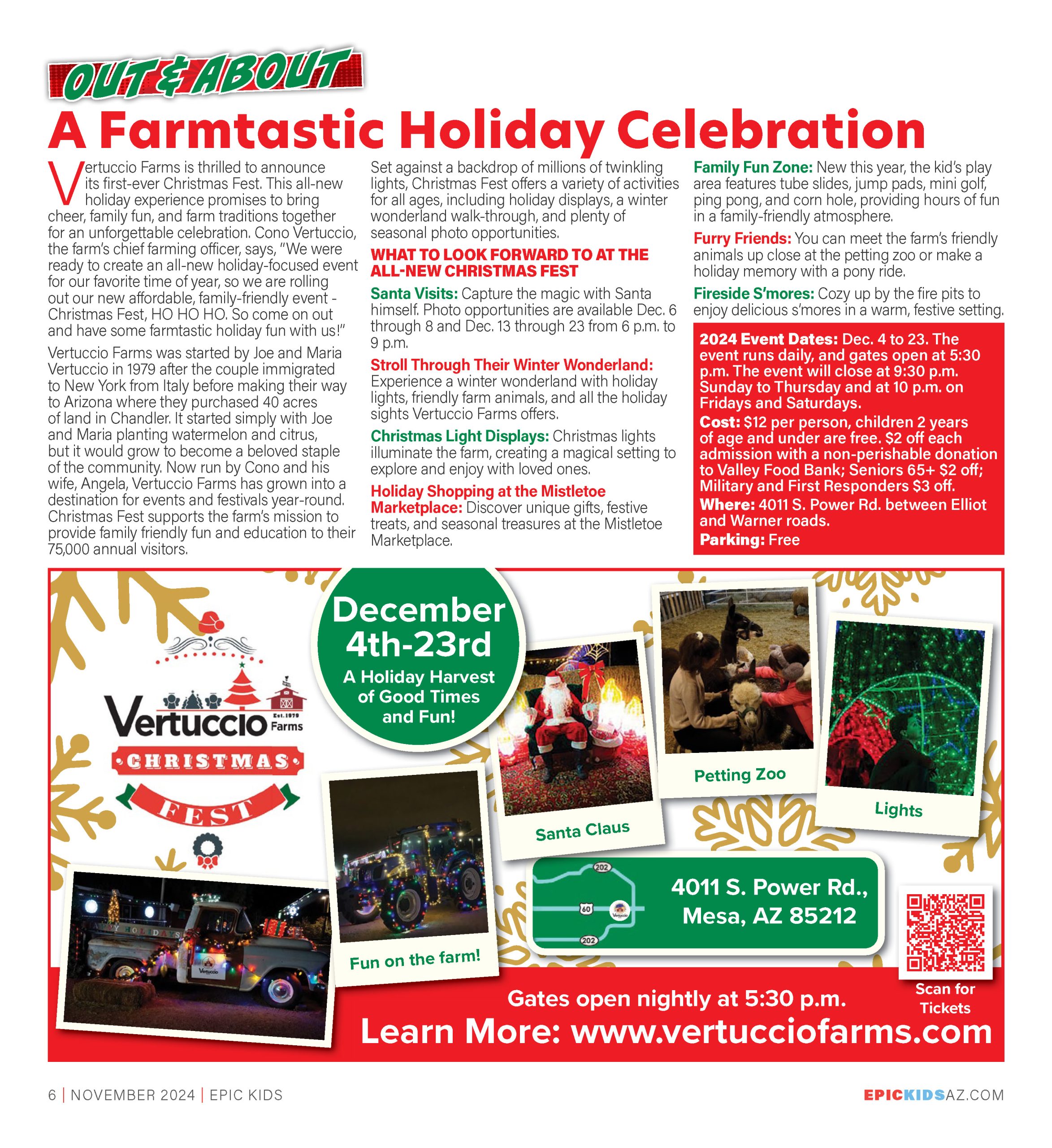 Vertuccio Farms was first started by Joe and Maria Vertuccio in 1979 after the couple immigrated to New York from Italy before making their way to Arizona where they purchased 40 acres of land in Chandler. Vertuccio Farms started simply with Joe and Maria planting watermelon and citrus, but it would grow to become a beloved staple of the community. Now run by Cono and his wife, Angela, Vertuccio Farms has grown into a destination for events and festivals year-round. Christmas Fest supports the farm’s mission to provide family friendly fun and education to their 75,000 annual visitors.