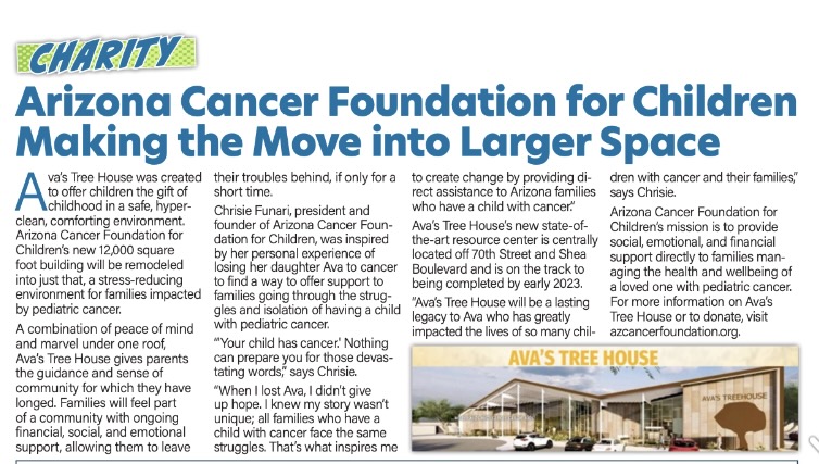 Ava’s Tree House’s new state-of-the-art resource center is centrally located off 70th street and Shea Boulevard and is on the track to being completed by early 2023.“Ava’s Tree House will be a lasting legacy to Ava who has greatly impacted the loves of so many children with cancer and their families,” says Funari.