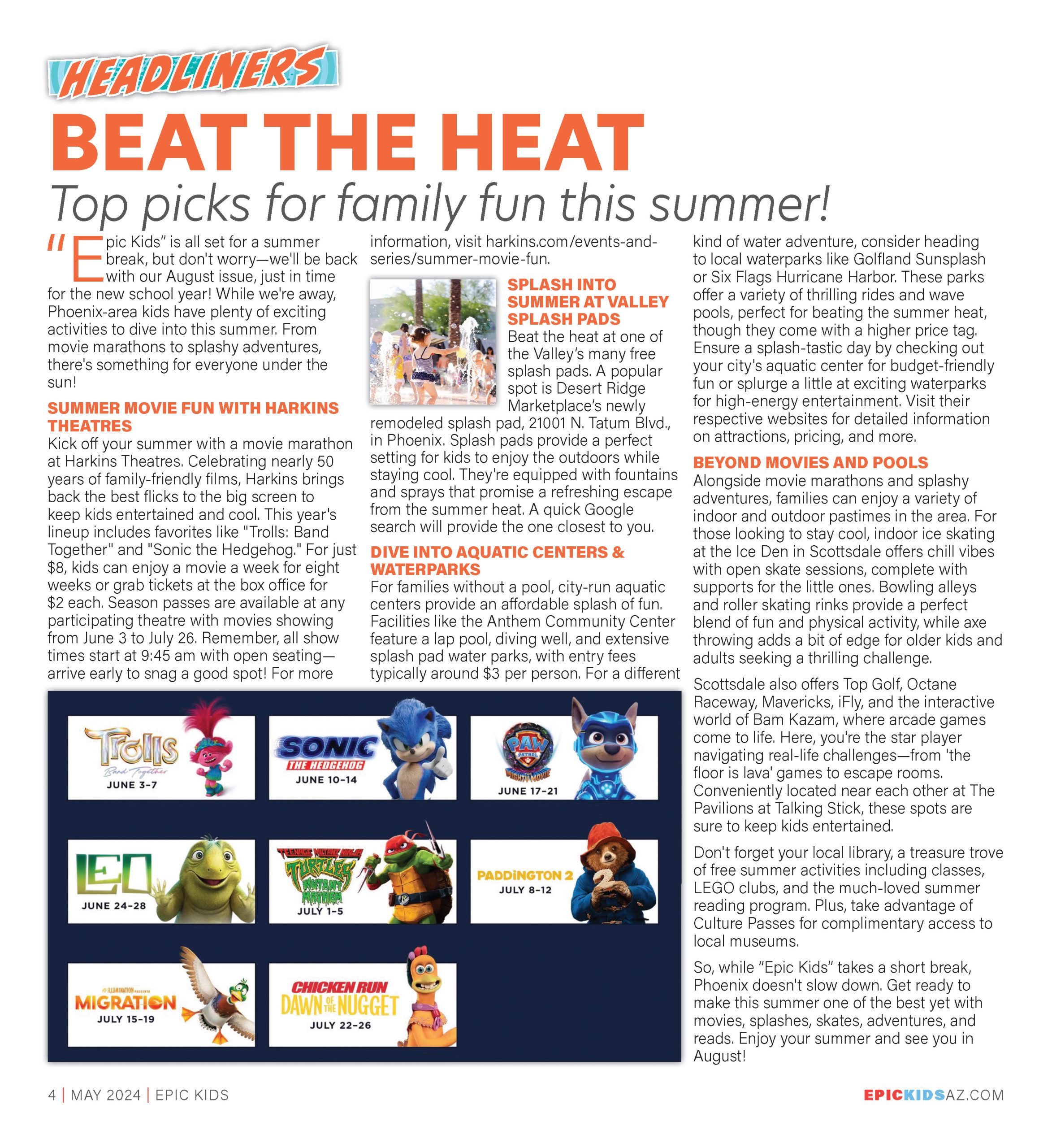 “Epic Kids” is all set for a summer break, but don’t worry—we’ll be back with our August issue, just in time for the new school year! While we’re away, Phoenix-area kids have plenty of exciting activities to dive into this summer. From movie marathons to splashy adventures, there’s something for everyone under the sun!