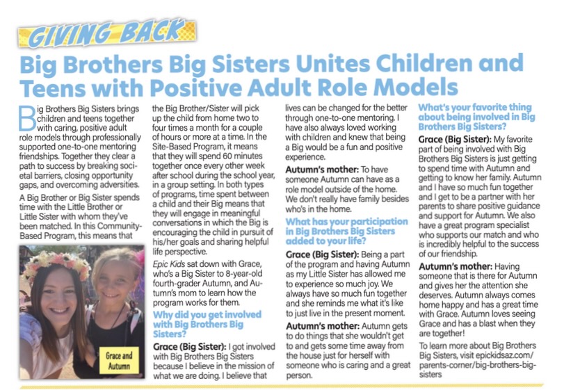 To learn more about Big Brothers Big Sisters, visit epickidsaz.com/parents-corner/big-brothers-big-sisters