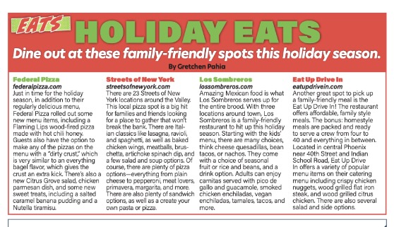 Amazing Mexican food is what Los Sombreros serves up for the entire brood. With three locations around town, Los Sombreros is a family-friendly restaurant to hit up this holiday season. Starting with the kid’s menu, there are many choices including cheese quesadilla, bean tacos, or nachos. They come with a choice of seasonal fruit or rice and beans, and a drink option. Adults can enjoy carnitas served with pico de gallo and guacamole, smoked chicken enchiladas, vegan enchiladas, and more.