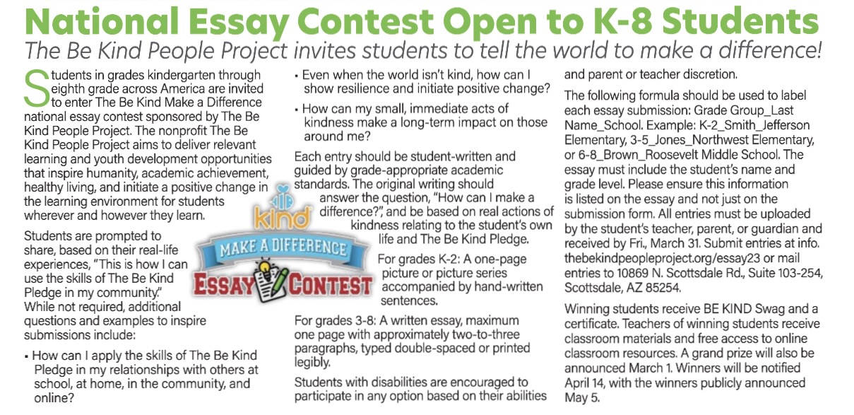 Students in grades kindergarten through eighth grade across America are invited to enter The Be Kind Make a Difference national essay contest sponsored by the Be Kind People Project. The nonprofit The Be Kind People Project aims to deliver relevant learning and youth development opportunities that inspire humanity, academic achievement, health living, and initiate a positive change in the learning environment for students wherever and however they learn.