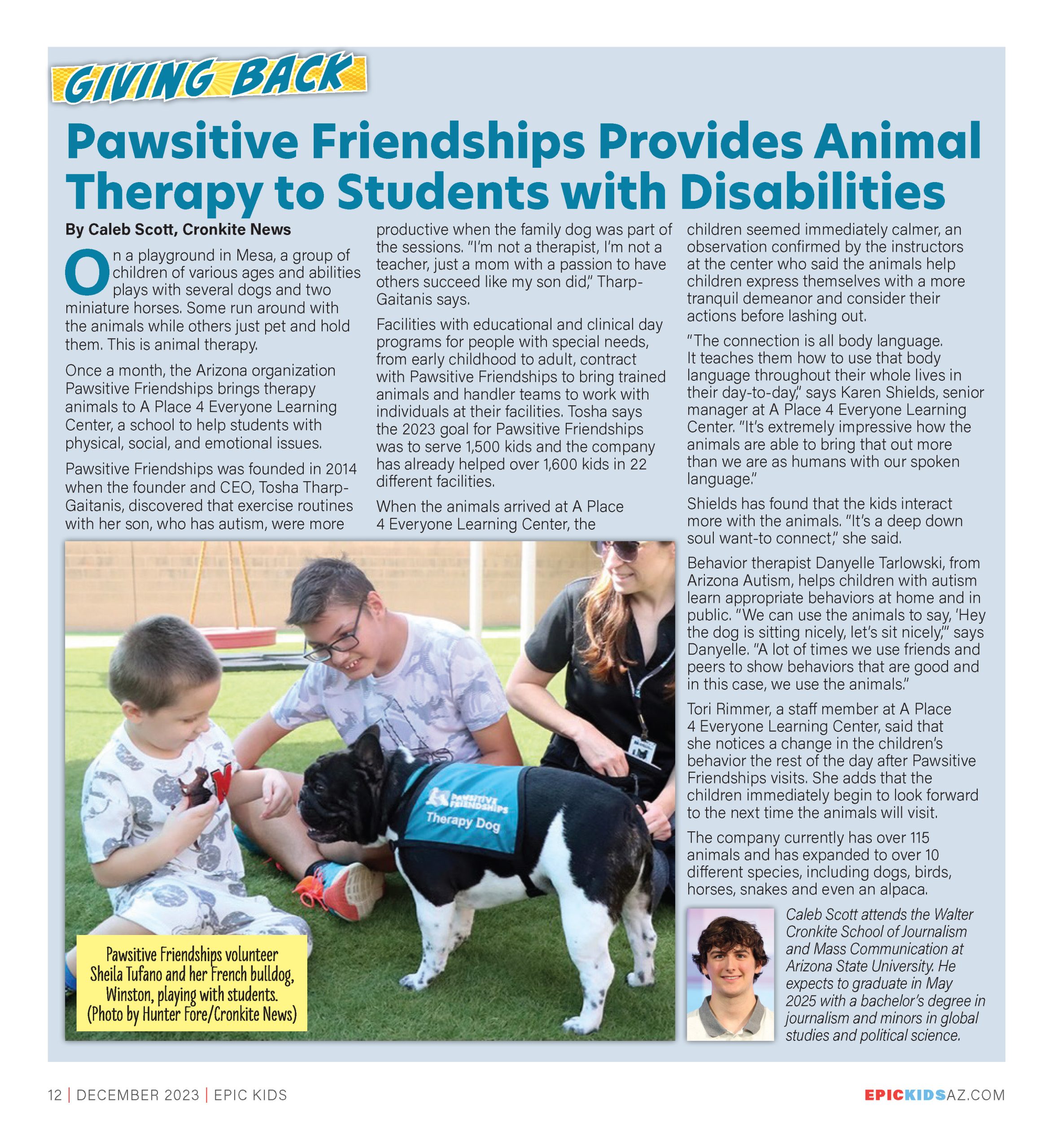 Once a month, the Arizona organization Pawsitive Friendships brings therapy animals to A Place 4 Everyone Learning Center, a school to help students with physical, social, and emotional issues.