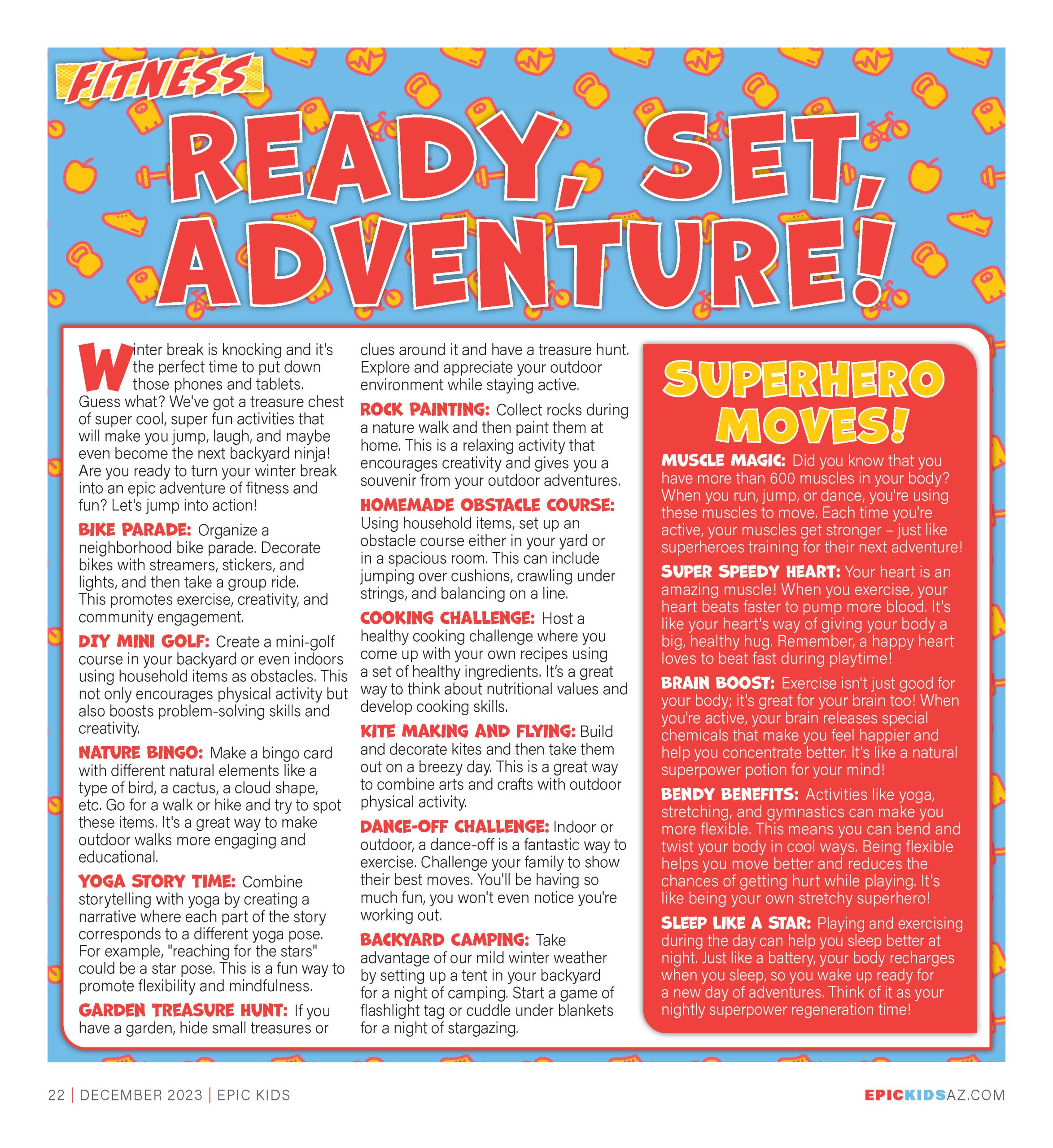 Muscle Magic: Did you know that you have more than 600 muscles in your body? When you run, jump, or dance, you’re using these muscles to move. Each time you’re active, your muscles get stronger – just like superheroes training for their next adventure!