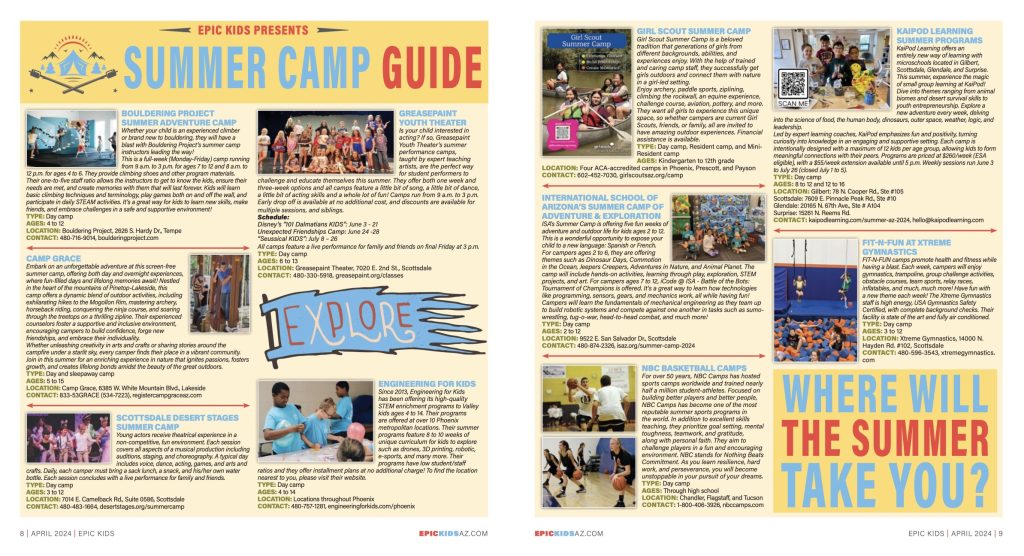 View Larger Image Summer Camp Guide: April 2024 Sondra Barr2024-04-12T14:35:48-07:00April 12, 2024|Categories: Parents' Corner|Tags: Summer Camp Guide April 2024| Hey there, parents and kiddos! Get ready for an epic summer because our EPIC KIDS Summer Camp Guide is packed with adventures waiting just for you! From rock climbing to robotics, and painting to performing, there’s a camp for every curious explorer and budding artist! Want to tackle challenges at the Arizona Bouldering Project, or perhaps create a masterpiece at Creative Color Art Studios? Check out the guide for all the amazing details and pick your adventure. Share This With Your Friends: FacebookXRedditLinkedInWhatsAppTumblrPinterestEmail Related Posts