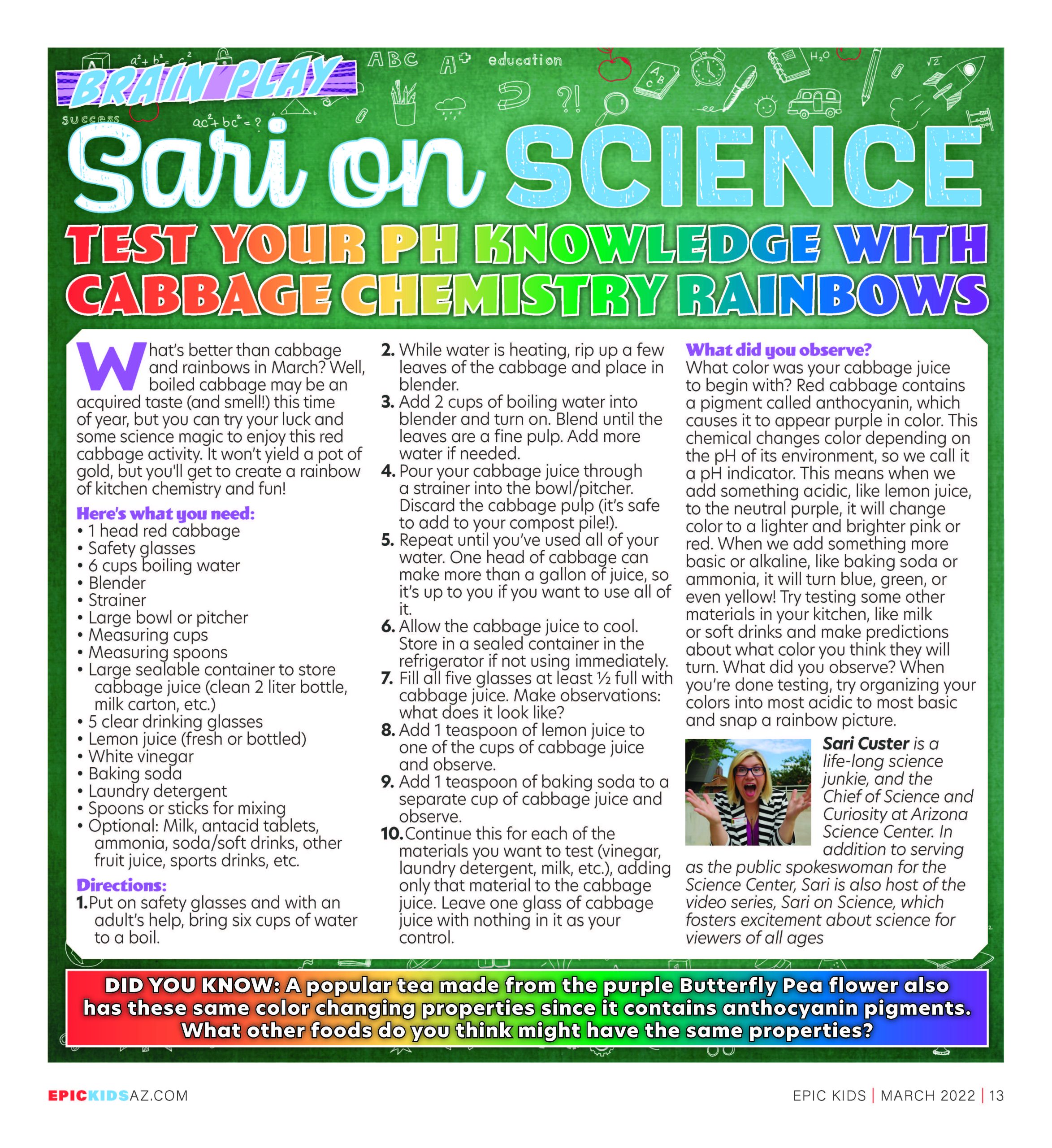 Sari on Science Test your pH knowledge with cabbage chemistry rainbows. What’s better than cabbage and rainbows in March? Well, boiled cabbage may be an acquired taste (and smell!) this time of year, but you can try your luck and ...