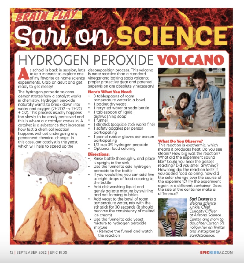 Hydrogen Peroxide Volcano As school is back in session, let’s take a moment to explore one of my favorite at-home science experiments. Grab an adult and get ready to get messy! The hydrogen peroxide volcano demonstrates how a catalyst works in ...