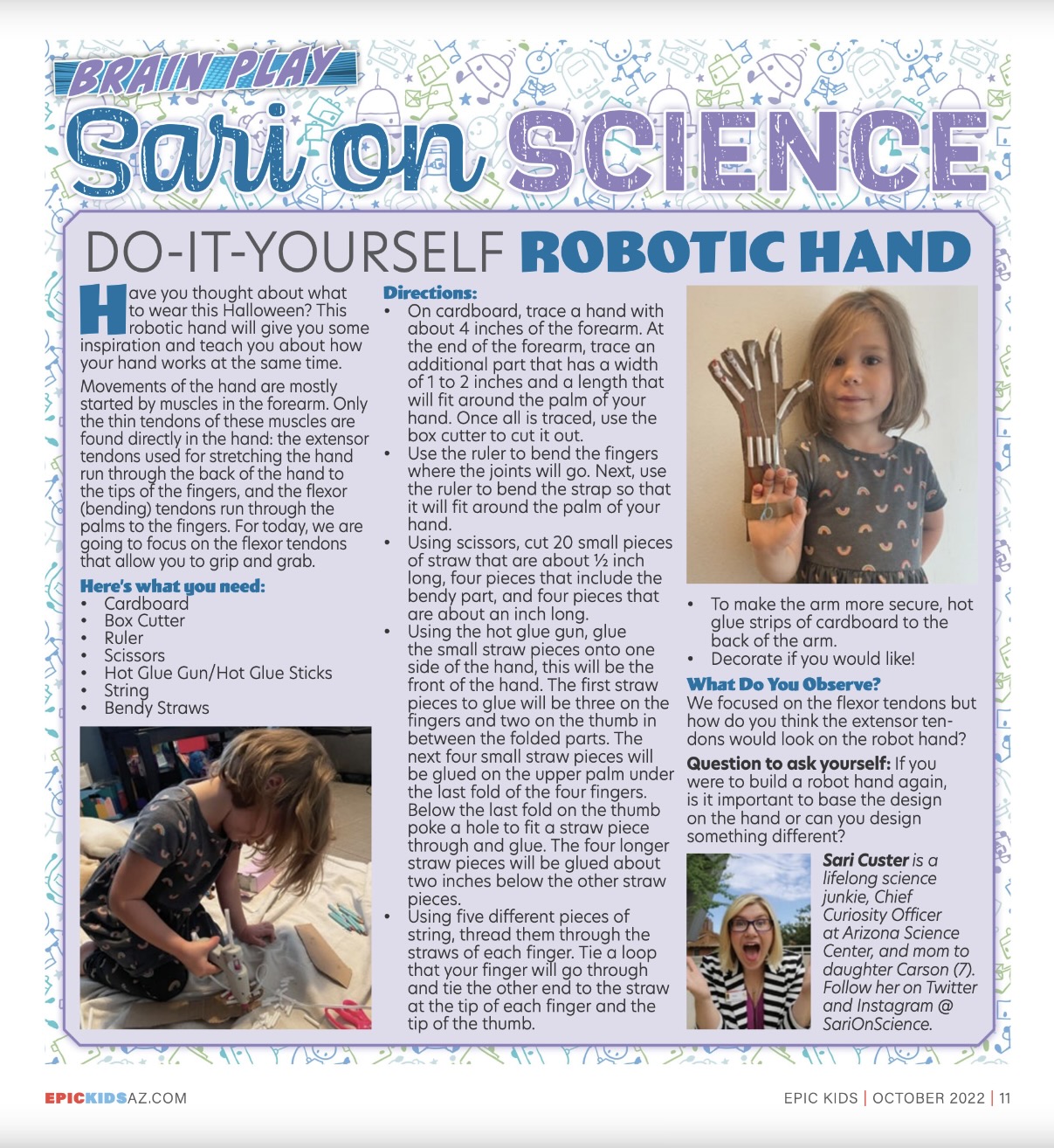 Sari on Science Do-it-yourself robotic hand. Have you thought about what to wear this Halloween? This robotic hand will give you some inspiration and teach you about how your hand works at the same time. Movements of the hand are ...