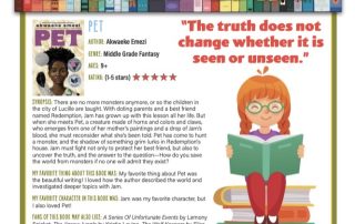 Epic Kids Book Club By Avery Finley Pet AUTHOR: Akwaeke Emezi GENRE: Middle Grade Fantasy AGES: 9+ SYNOPSIS: There are no more monsters anymore, or so the children in the city of Lucille are taught. With doting parents and a ...
