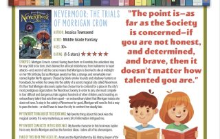 By Avery Finley Epic Kids Book Club Selection: NEVERMOOR: THE TRIALS OF MORRIGAN CROW AUTHOR: Jessica Townsend GENRE: Middle Grade Fantasy AGES: 10+ SYNOPSIS: Morrigan Crow is cursed. Having been born on Eventide, the unluckiest day for any child to ...